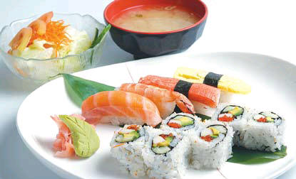 101 Combo A.......................................................... 7.50 Miso Soup & Green Salad 2 pc. California Rolls 2 pc. Cucumber Rolls Spring Roll & Vegetable Tempura Chicken Teriyaki Steam Rice Fresh Fruit 102 Combo B.......................................................... 7.75 Miso Soup & Green Salad 2 pc. California Rolls 2 pc. Cucumber Rolls Spring Roll & Vegetable Tempura Salmon Teriyaki Steam Rice Fresh Fruit 103 Combo C............................................................................. 8.50 Miso Soup & Green Salad 2 pc. California Rolls 2 pc. Cucumber Rolls Spring Roll & Vegetable Tempura BBQ. Beef Rib Steam Rice Fresh Fruit 104 Combo D.......................................................... 7.95 Miso Soup & Green Salad 2 pc. California Rolls 2 pc. Cucumber Rolls Spring Roll & Vegetable Tempura White Fish Cutlet Steam Rice Fresh Fruit 105 Combo E......................................................... 7.95 Miso Soup & Green Salad 2 pc. California Rolls 2 pc. Cucumber Rolls Shrimp & Vegetable Tempura Steam Rice Fresh Fruit 106 Combo F......................................................... 7. 95Miso Soup & Green Salad 6 pc. California Rolls 6 pc. Alaska Rolls Salmon, Avocado, Cucumber & Fly Fish Egg Fresh Fruit 107 Combo G........................................................ 7. 95Miso Soup & Green Salad 6 pc. California Rolls 6 pc. BBQ. Eel Roll Fresh Fruit 108 Combo H......................................................... 7.75Miso Soup Green Salad with Crab Meat 6 pc. California Rolls Fresh Fruit 109 Combo I.......................................................... 7.95Miso Soup & Green Salad Pan Fried Chicken & Vegetable Udon Fresh Fruit 110 Combo J......................................................... 8.50 Miso Soup & Green Salad 4 pcs Daily Sushi (Salmon, Shrimp, Crab, Egg) 6 pc. California Rolls Fresh Fruit 111 Combo K........................................................ 8.50 Miso Soup & Green Salad 2 pc. California Rolls 2 pc. Cucumber Rolls Japanese Style Curry Chicken or Port Cutlet Steam Rice Fresh Fruit
