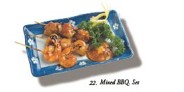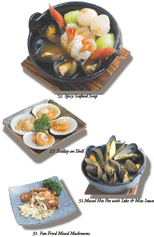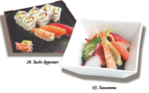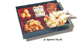 18 B.B.Q. Scallops..................................................................5.50 3 Skewered Scallops Grilled with Sauce 19 Grilled Black Cod Fish......................................................5.50 20 B.B.Q. Beef Short Ribs......................................................5.50 B.B.Q. Marinated Beef Ribs 21 Grilled Scallop with Bacon................................................5.50 22 Mixed B.B.Q. Set................................................................5.50 Skewered Scallops, Chicken, Shrimps and Japanese Mushrooms 23 Tempura Appetizer............................................................5.50 Deep Fried Shrimp and Vegetables 24 Negima Yaki........................................................................5.50 Thinly Sliced Beef wrapped around Green Onions Grilled & served with Teriyaki Sauce 25 Urajiro.................................................................................5.95 Deep Fried Japanese Mushrooms stuffed with Shrimp 26 Enoki Beef Roll (4 pc.)......................................................5.95 Thinly Sliced Beef wrapped around Baby Mushroom 28 Sushi Appetizer.................................................................6.95 9 pc. of Assorted Sushi & Roll 29 Sashimi Appetizer..............................................................6.95 8 pc. of Daily Fish & Seafood 30 Beef Sashimi......................................................................6.95 Sliced slightly frilled Raw Beef served with Ponzu Sauce 31 Pan Fried Mixed Mushroom...............................................6.95 Pan Fried Mixed Mushroom with Butter 32 Soft Shell Crab..................................................................6.95 Deep Fried Soft Shell Crab served with Ponzu Sauce 33 Appetizers Tray (A) in Bento Box.................................9.95Shrimp & Vegetable Tempura, Grilled Asparagus with Bacon, BBQ Beef Ribs,Yaki Tori, 4 pc. California Roll 34 Appetizers Tray (B) in Bento Box.................................9.95Lobster Ball, B.B.Q. Beef Ribs, Chicken Karaga, Shrimp & Vegetable Tempura, 4 pc. California Roll 50 Miso Soup...........................................................................1.50 51 Mussel Hot Pot w/ Sake & Miso Sauce (for two).................................................................................. 4.95 52 Spicy Seafood Soup (for two)..........................................4.95 60 Tofu Salad..........................................................................3.50 61 Avocado Salad...................................................................4.95 62 Kaiso Salad........................................................................4.95 Green Salad with Fresh Seaweed 63 Sunomono...........................................................................4.95 Assorted Seafood & Fresh seaweed with House Sauce